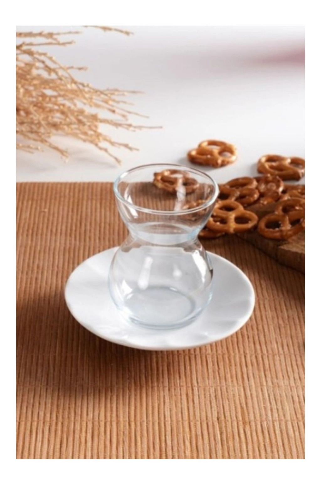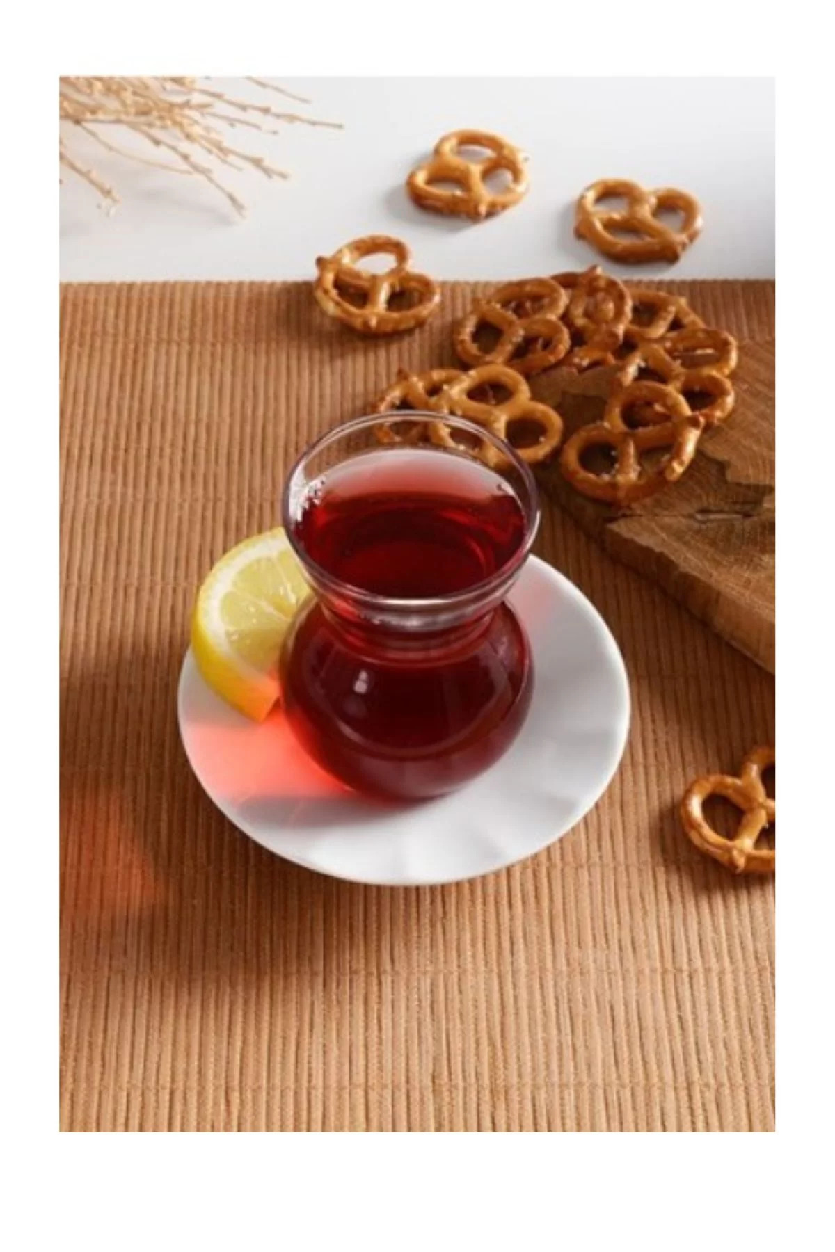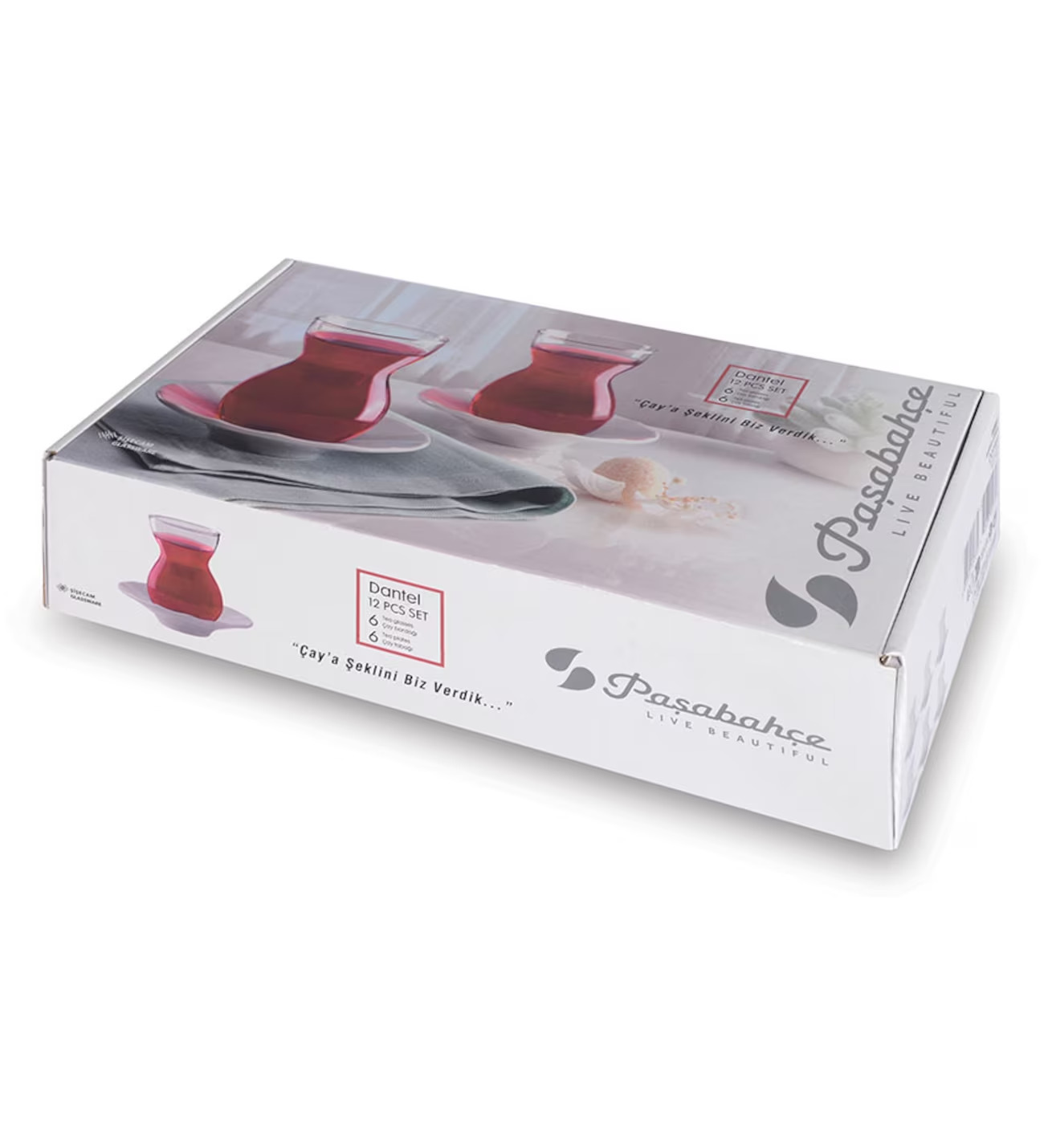 Pasabahce Dantel Teeglas Set 12 Teilig mit weißen Porzellan Untertassen