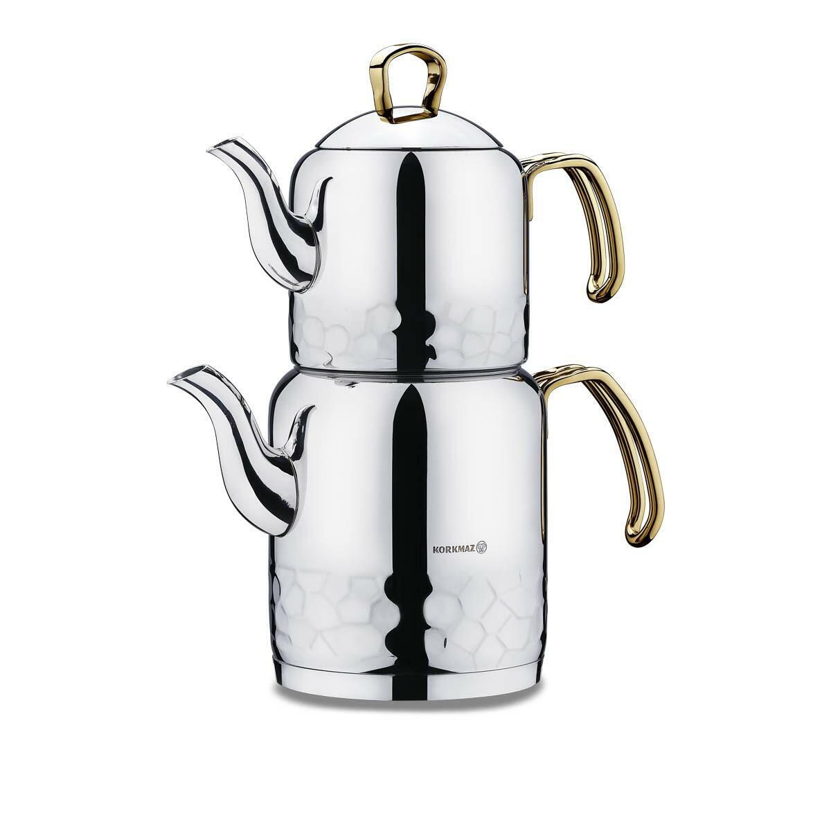 Korkmaz Erna Gold A227-02 Teekanne Teekocher 3,4 Liter Induktion, Hochwertiges türkisches Teekannen-Set, Caydanlik Edelstahl silber mit Goldgriff